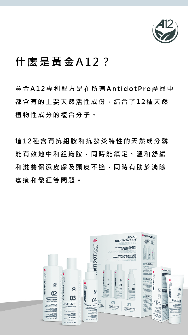 1號頭皮控敏阻抗劑 可以為肌膚最外層的保水屏障提供保濕潤澤,在染髮和化學服務過程中補充水分並保護頭皮的完整性。 商品特色 : ANTIDOTPRO獨特分子「黃金A12」,採用多種天然活性成分,含有抗組織胺特性,可中和組織胺進而降低過敏反應。 不做動物實驗、且100% 純素天然成分。 提升靈活便利性,可與市售任一品牌的專業染髮劑或結構還原產品混合使用,且不影響染燙/髮功效。 重點 : 採用獨家專利配方黃金A12,內含12種天然植物成分,具有抗組織胺和抗發炎的特性。 可緩解顧客在進行化學療程或服務中會產生的瘙癢、刺痛、灼熱、發紅和其他不適感,但絕不會影響化學服務的成果。 可以為肌膚最外層的保水屏障提供保濕潤澤,在染髮和化學服務過程中補充水分並保護頭皮的完整性。